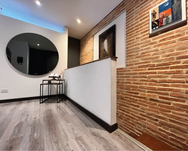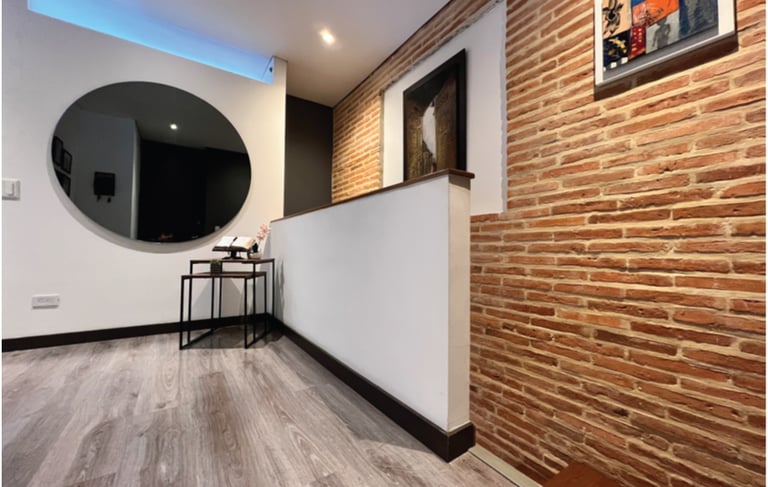 Adecuación de apartamento duplex con elementos modernos e industriales, desde el recibidor, habitaciones, sala-comedor, cocina y balcón. Combinamos materiales modernos cómo piso laminado en acabado tipo madera, con materiales industriales cómo ladrillo a la vista. Utilizamos tonos grises y blancos y los contrastamos con muebles en maderas claras.