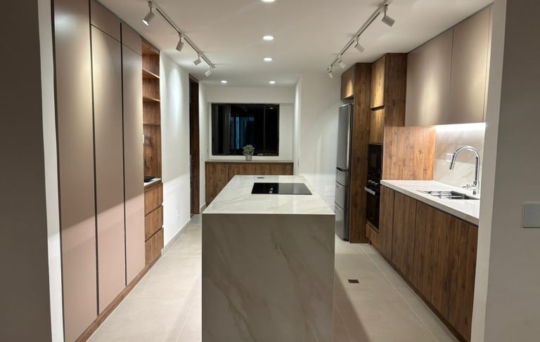 Remodelación de cocina en apartamento con mas de 20 años de antigüedad. Pasando de un espacio cerrado con acabados mas tradicionales a una cocina abierta con un diseño minimalista y elegante, que convina los tonos en maderas intermedias, con taupé y blanco. Una isla central diseñada para el espacio, en el mismo acabado del mesón de cocina en piedra sinterizada y vetas que juegan con los tonos del mobiliario. La vista de la cocina desde la sala deja ver el juego de los materiales y acabados utilizados así como el diseño de iluminación en tres escenas con tonos neutros y acentos cálidos.